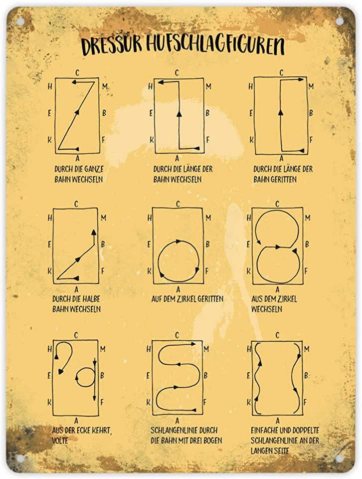 Am Reitplatz (und in der Halle) gibt es Markierungen. Du musst mit deinem Pferd (das zum Glück ein Schulpferd ist, weil Du auch nicht reich bist und daher kein eigenes hast, es daher die Scheiß Hufschlagfiguren eh kennt, im Gegensatz zu Dir) diese Figuren ausführen. Das heißt, 1. Du musst dir das merken (weil das Pferd Dir nix einsagen wird) und 2. Du musst das Pferd ohne Zwang und Gewalt dazu bringen, das auch zu tun (Ich sag nur, danke Herzi (Herzog), du hast das alles fast von allein gemacht) und 3. Du musst dabei SCHÖN reiten. (4. fürchtest Du dich, weil Du weißt, dass die Reitlehrerin gleich wieder schreien wird mit Dir)